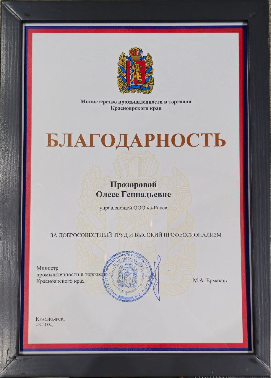 В 2024 году руководитель компании ООО «А-Рокс» Олеся Геннадьевна Прозорова была удостоена благодарности от Министра промышленности и торговли Красноярского края за её добросовестный труд и высокий профессионализм. Этот знак признания является свидетельством большого вклада компании в развитие промышленности региона и её стремления к высоким стандартам качества и ответственности.